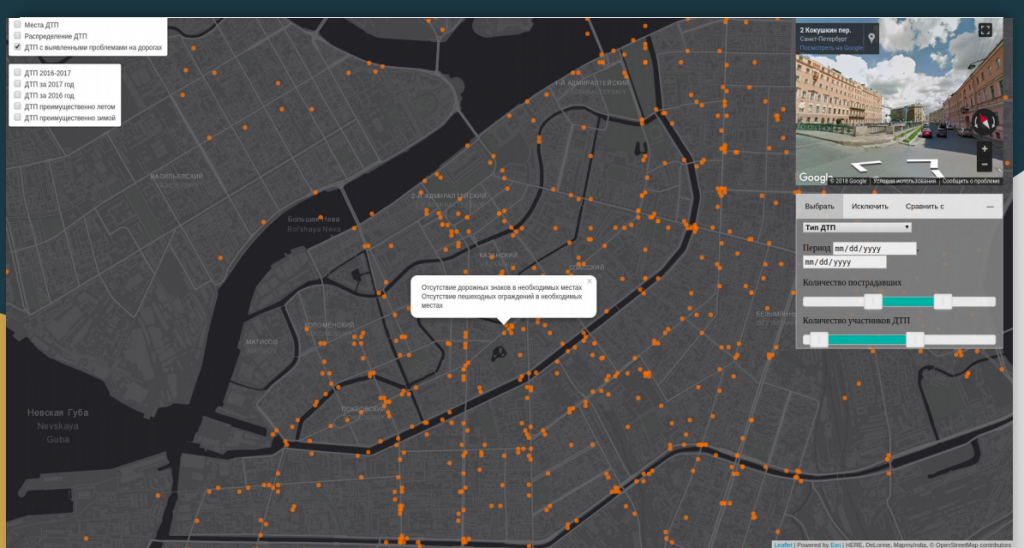Цель проекта: снизить количество ДТП. За хакатон удалось создать интерактивную карту на основе анализа самых аварийных и опасных участков в Питере. Для этого участники скачали данные ГИБДД за три года, унифицировали их, создали прототип сервиса для динамической визуализации на карте ДТП в зависимости от различных параметров и разработали модуль работы с тепловыми картами. Также с помощью карты удалось проанализировать, на каких участках не хватает дорожных знаков. Вся информация поможет спасти жизни людей за счет установки знаков.