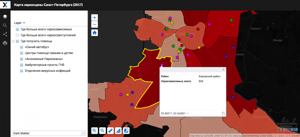 Карта создана на веб-сервисе NextGis и состоит из трех слоев. Первый слой показывает ситуацию с наркопреступностью в Санкт-Петербурге в 2017 году. Второй слой показывает, сколько наркозависимых было официально зарегистрировано на территории района в 2017 году. Третий слой – доступные виды помощи для людей, употребляющих наркотики: группы взаимопомощи «Анонимные наркоманы», амбулаторные отделения Городской наркологической больницы, мобильный пункт фонда «Гуманитарное действие».