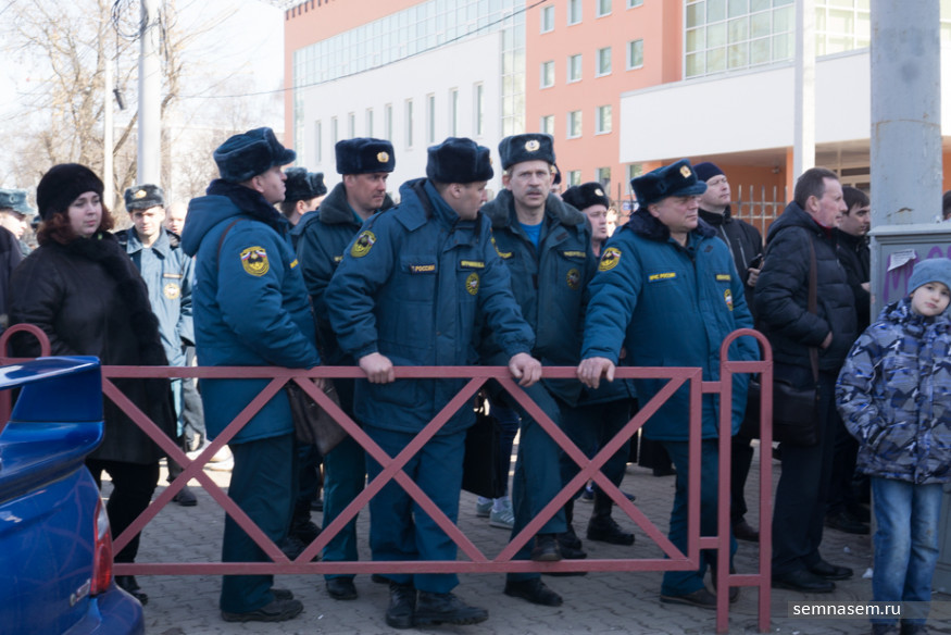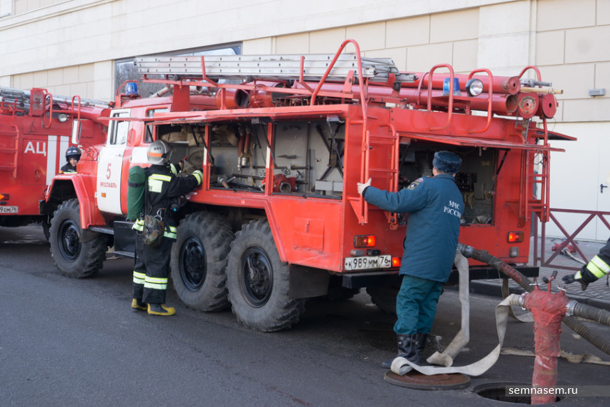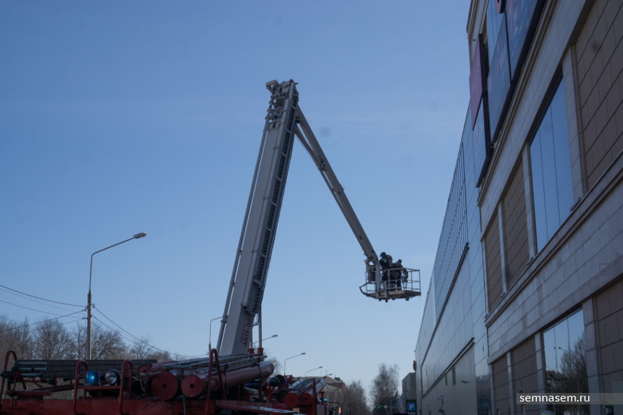 На улице к тому времени уже столпилось около ста человек. На парковку во дворе «Ауры» заехала пожарная машина с лестницей, двое сотрудников МЧС, не торопясь, поставили лестницу и направили ее на третий этаж торгового центра (по сценарию учений задымление произошло именно там). Всех зевак охрана прогнала с парковки за сугроб, аргументируя тем, что всем нужно отойти на 35 метров от «горящего» здания. К установленной лестнице подъехал расчет пожарных и отправился на третий этаж.