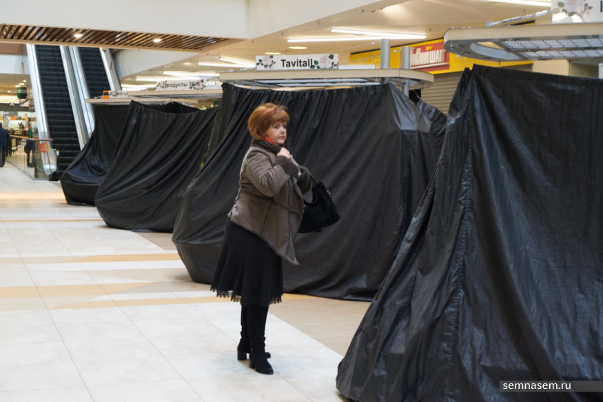 За пять минут до мероприятия в коридорах ТЦ уже все готово было к тренировке МЧС: продавцы надевали куртки, желающие проконтролировать сотрудников центра собрались в атриуме на минус первом этаже, куда заблаговременно поставили стенд с планом эвакуации. Сотрудники МЧС стояли у входов в торговый центр еще до тревоги. К намеченному времени самые опытные продавцы уже накрыли тентами свои торговые точки.