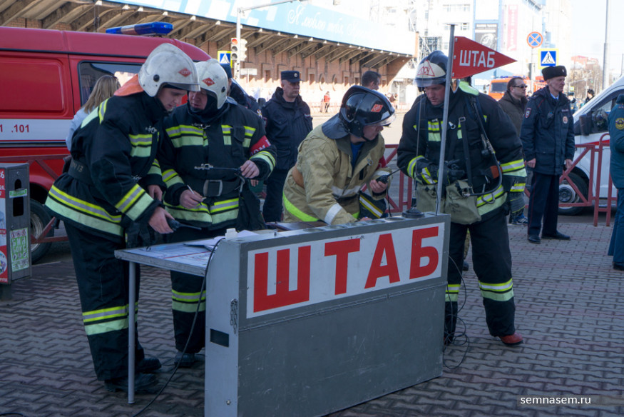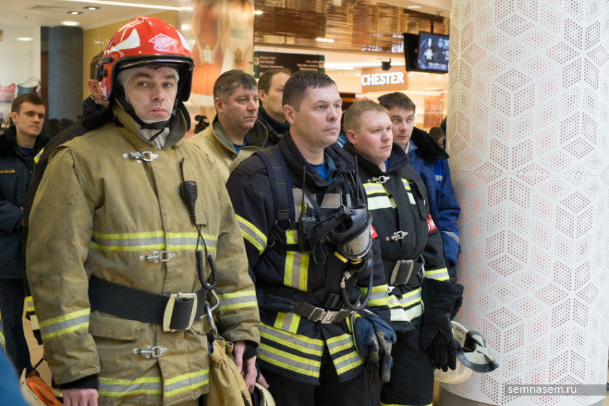 В это время со стороны входа в ТЦ на улице Победы остановилось более десятка машин МЧС, одна из них была оборудована 50-метровой вышкой. Там же развернули оперативный штаб и запустили дрона. Согласно сценарию, спасатели эвакуировали из задымленного кинотеатра в «Ауре» семерых «пострадавших». Съемочные группы телеканалов пропустили внутрь торгового центра во время эвакуации, остальные журналисты ждали окончания учений на улице.