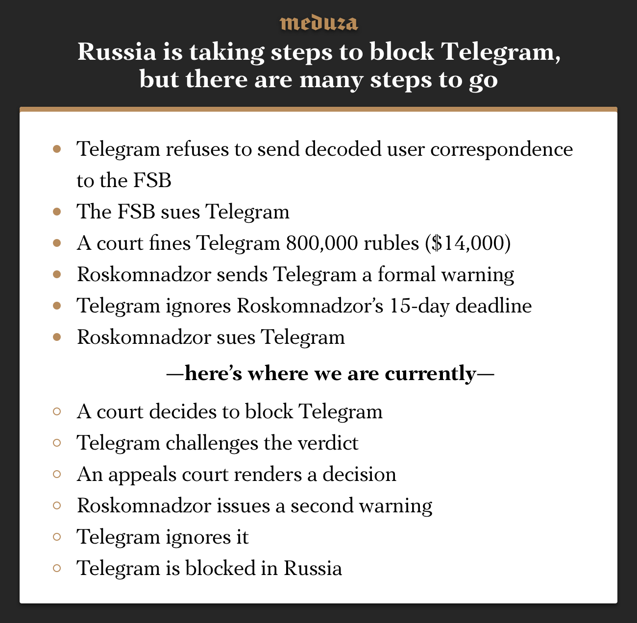 Pavel Chikov, a lawyer for the “Agora” human rights group, which is representing Telegram, says the company’s position remains unchanged. “The FSB’s demands to provide access to users’ private correspondence are unconstitutional, legally unfounded, technically and legally unenforceable, and blocking the service is therefore unreasonable,” Chikov said on Friday.