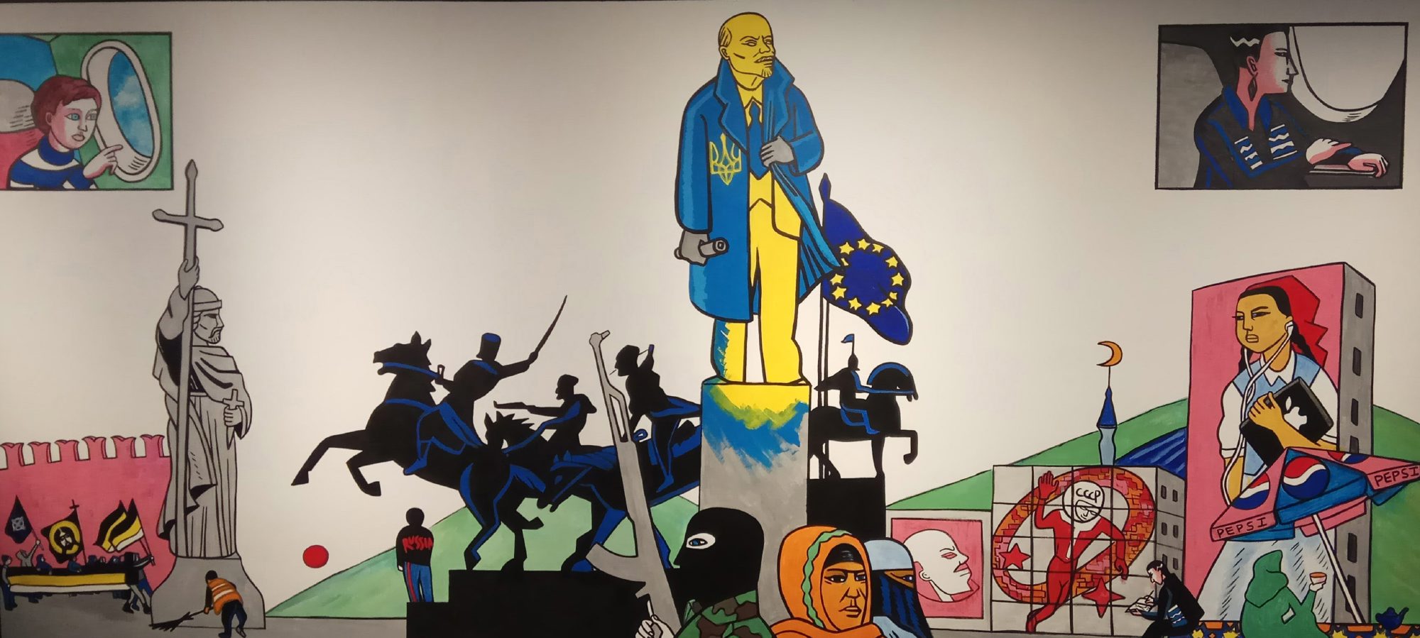 Фреска «Наш постсоветский край»Фото: Виктория Ломаско На фреске мальчик из журнала далеко не улетел, его полет тормозит крест монумента в честь Владимира Святого. В пространстве Москвы бывшие советские мальчики стали националистами, а те, кто угощал их виноградом, — трудовыми мигрантами. Почему так получилось? «Мне кажется, что и в советское время люди чувствовали негласную иерархию. Русские были титульной нацией. Белорусы и украинцы — младшими братьями. Потом кавказские народы — они не славяне, от нас дальше, но у них древняя культура, солнце, море и вкусная еда. И, наконец, народы Средней Азии, чьи территории были насильственно присоединены в ходе колониальных войн, а в советская время достаточно произвольно поделены на республики», — размышляет Виктория.