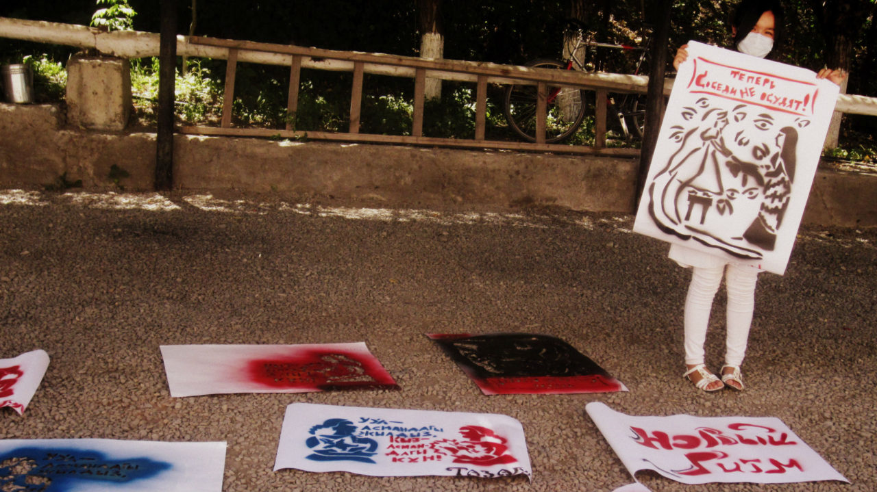 Объявление в кондитерском комбинате, где работал ЧингизИллюстрация: Чингиз Айдаров В городе Ош Виктория Ломаско два лета подряд работала с группой молодых местных девушек, увлекающихся рисованием. Несколько мастер-классов были посвящены трафаретам на феминистские и социальные темы, которые волновали участниц. Многие в группе сказали, что не хотят жаловаться на свои проблемы, например, на домашнее насилие, но хотят создать позитивные образы, чтобы вдохновлять себя и других. Один из получившихся плакатов обыгрывает кыргызскую поговорку «Уважай каждую мою косичку». На лентах, которые украшают традиционную женскую прическу, написаны ценности женщины — образование, хобби, семья, друзья. Другой плакат поднимает проблему того, что в узбекских семьях девушек очень рано отдают замуж. Автор плаката боялась, что время уже пришло: хотя ее семья довольно либеральная, давление оказывали соседи.