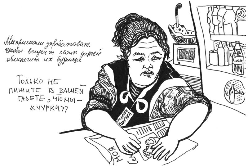 «Первый раз я рисовала мигрантов для оформления художественной газеты «Что делать?«, выпуск был посвящен трудовому рабству. Чтобы нарисовать для газеты серию иллюстраций, я решила посмотреть, кто убирает мой двор, кто работает на соседней стройке, кто торгует в магазине, где я покупаю еду. Некоторые мигранты согласились со мной поговорить. Я нарисовала строителя, который плохо понимал, зачем я трачу его драгоценное время: «Быстрей рисуй, работать надо». Одной продавщице я объяснила, что рисую для газеты в поддержку прав мигрантов. Она согласилась: «Ну ладно. Вот, запишите, что мы сюда приезжаем, чтобы заработать для наших детей, чтобы они могли учиться. Но только не пишите, что мы “чурки”».