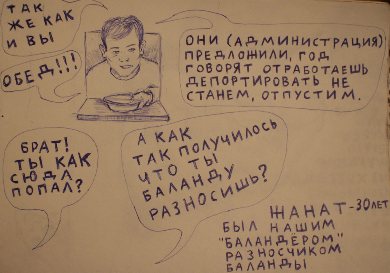 Трудовой мигрант в спецприемнике №1 разносит баландуИллюстрация: Чингиз Айдаров Потом Чингиз работал на кондитерском комбинате. Он рассказывает, что там постоянно случались конфликты между грузчиками-мигрантами и русскими бригадирами, которые не до конца понимали рабочий процесс. Сейчас Чингиз работает грузчиком и рисует будни мигрантов в жанре графического репортажа. У него классическое художественное образование, он уже выставлялся в Москве. Также Чингиз размышляет над будущим проектом в формате видео или перформанса».