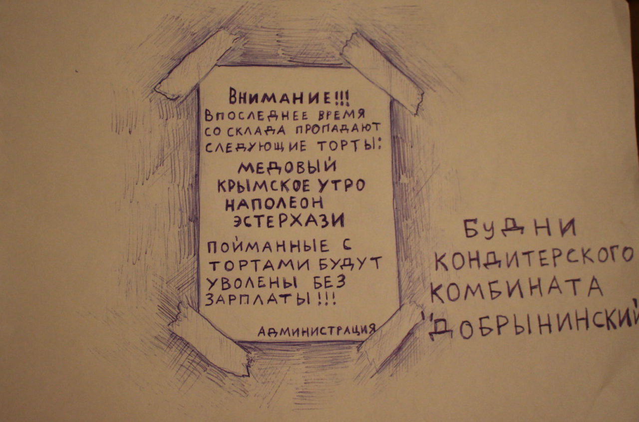 Рисунок для газеты «Что делать?»Иллюстрация: Виктория Ломаско Единственное по-настоящему примечательное знакомство произошло на территории Artplay, где проходило Биеннале современного искусства, а рядом шла стройка. Когда я рисовала бытовки, ко мне подошел Юнус и сказал, что он из Кыргызстана и тоже любит рисовать. Юнус рассказал, что вместе с другими трудовыми мигрантами хотел зайти на Биеннале современного искусства, но их не пустили. Юнус и его друзья хотели оплатить вход, но им отказали без объяснения причин. Тогда мигранты устроили в бытовке свою выставку зарисовок, сделанных во время планерок. Они сказали: «Это наш параллельный проект».