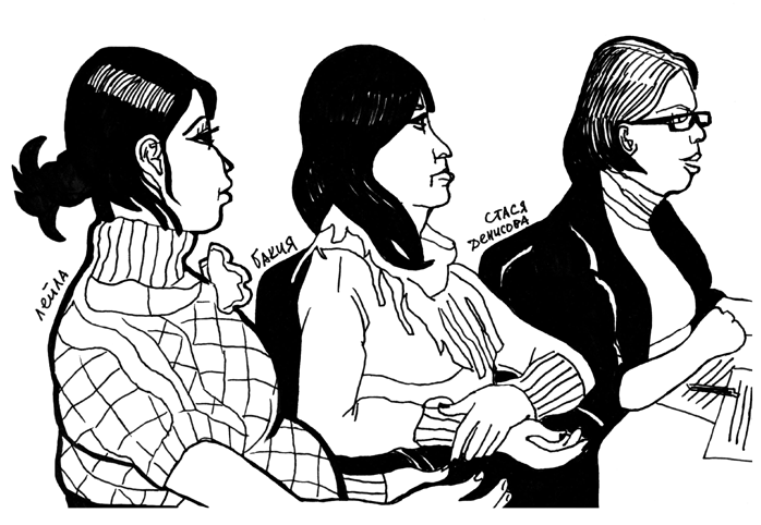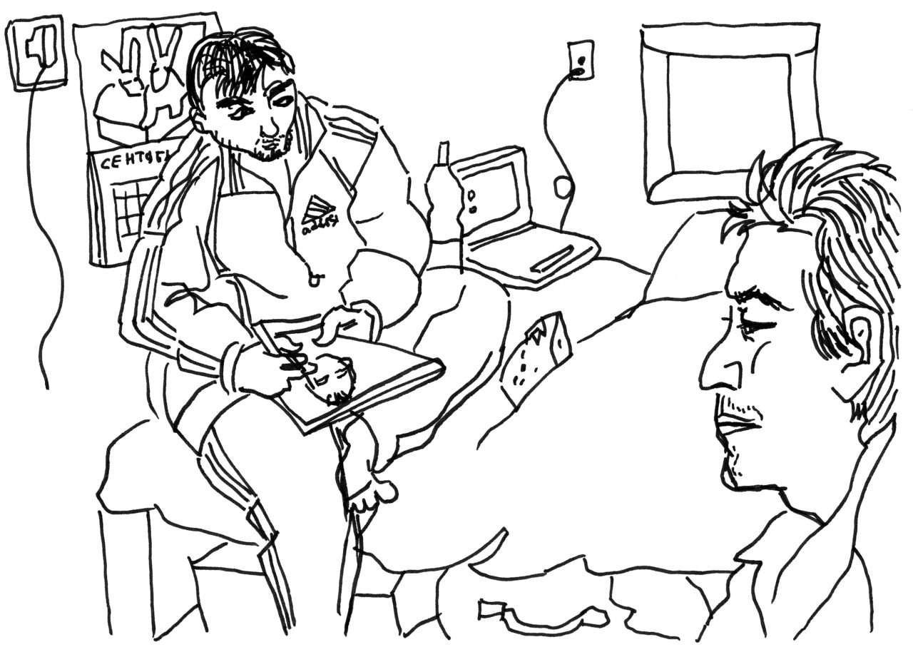 Юнус рисуетИллюстрация: Виктория Ломаско Не все мигранты были так общительны, как Юнус, многие не хотели со мной общаться. Люди не понимали, почему я их рисую. Они и так живут практически в условиях гетто, и вдруг еще появляется какой-то человек с альбомом. Стало понятно, что подглядывать, подслушивать и приставать к мигрантам с расспросами — это дурацкий способ работы. Лучше присоединиться к правозащитным организациям, которые занимаются их проблемами. В Комитете «Гражданское содействие» мне разрешили документировать, как сотрудники проводят собеседование с мигрантами и помогают им.