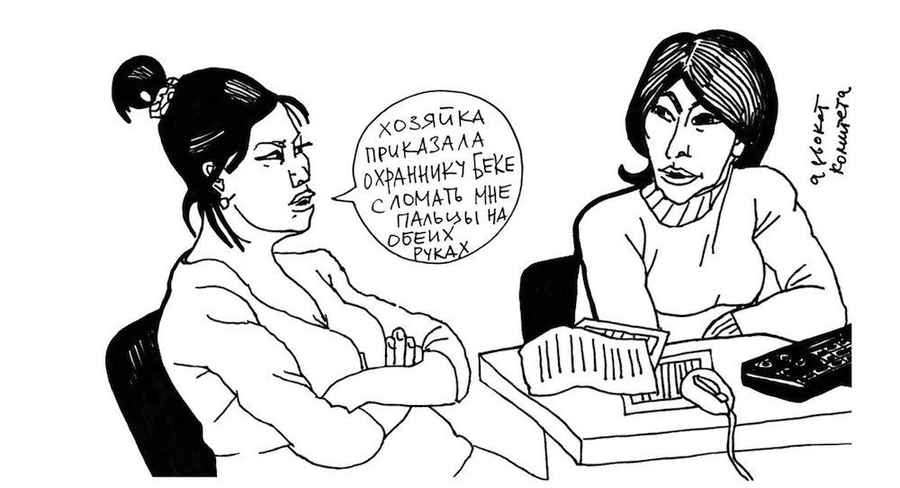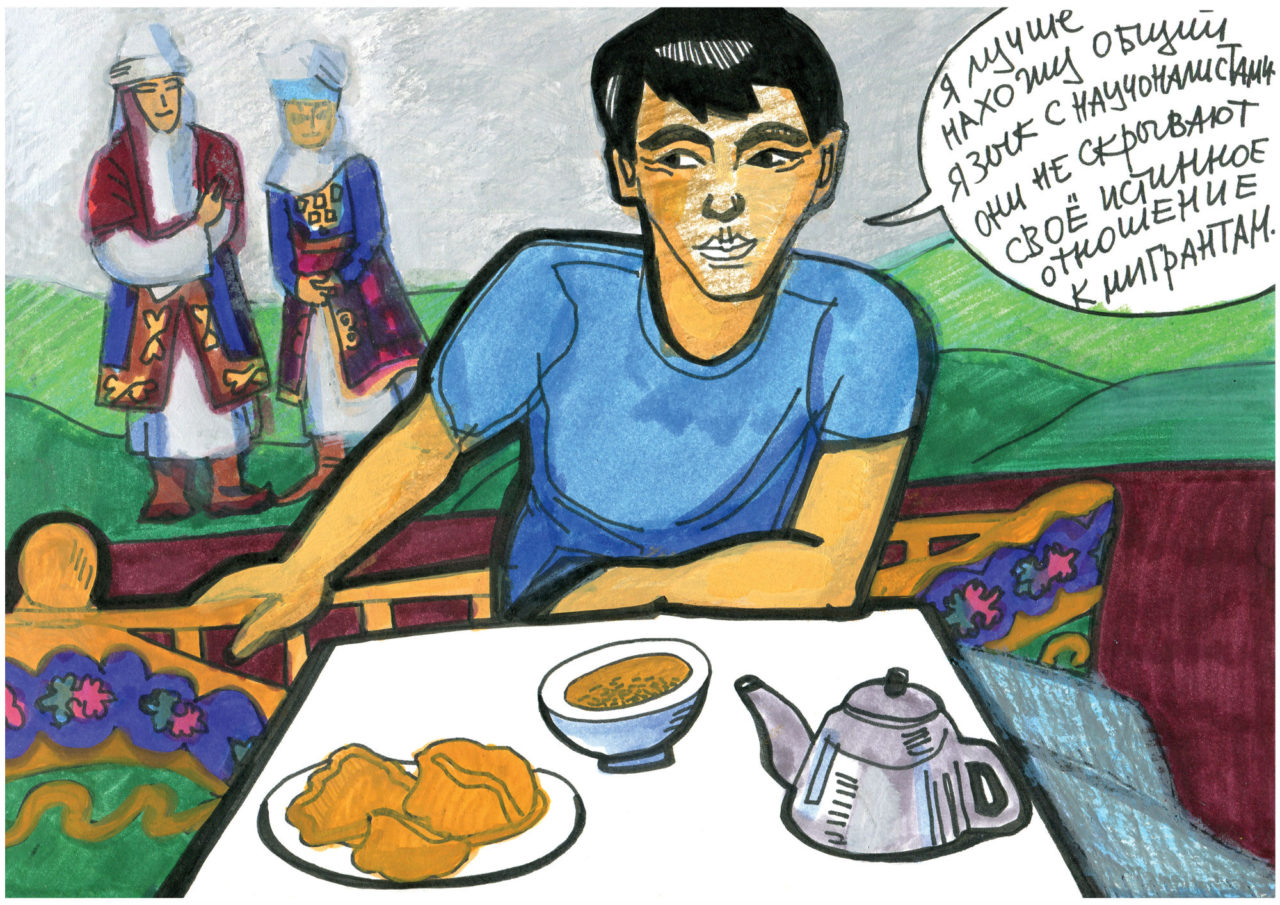 Рисунок из графического репортажа «Поездка в Ош»Иллюстрация: Виктория Ломаско Как работают художники из мигрантской среды