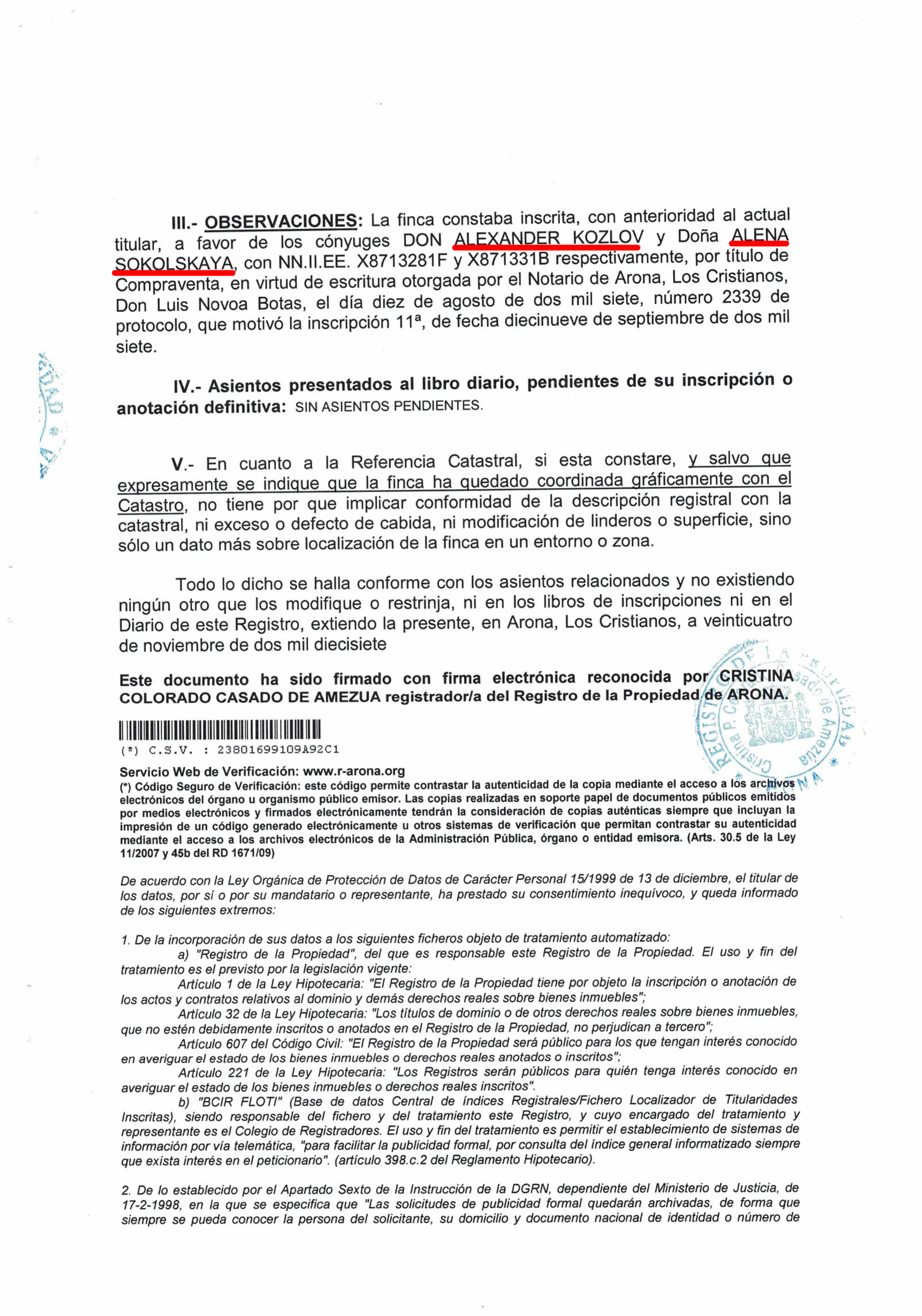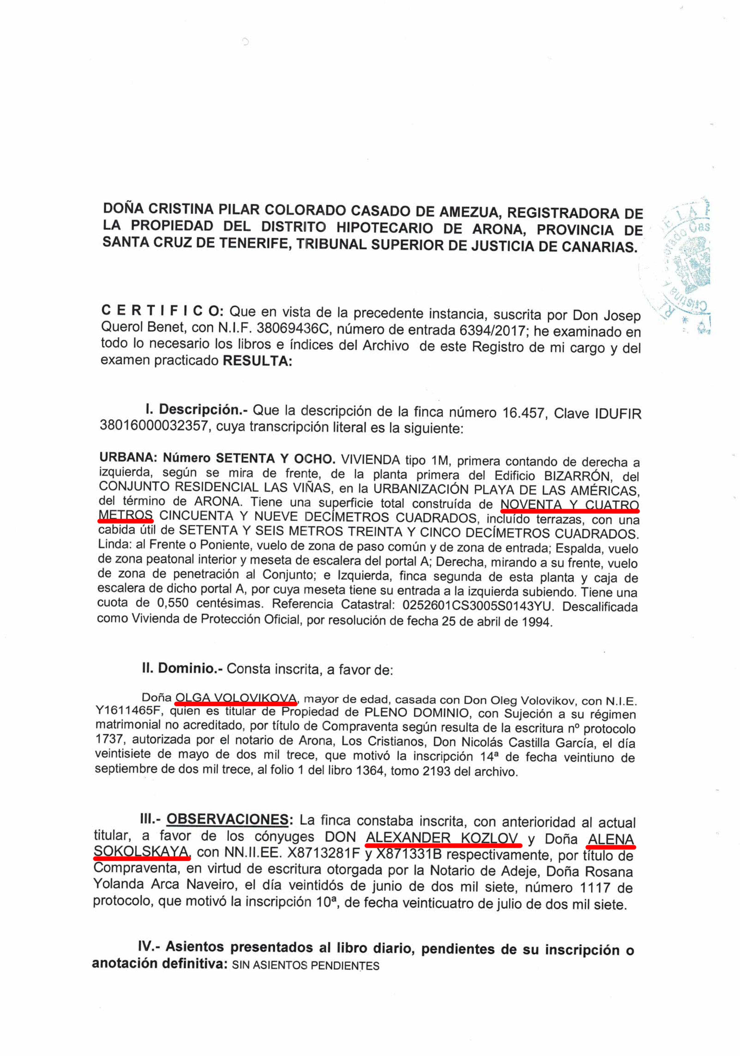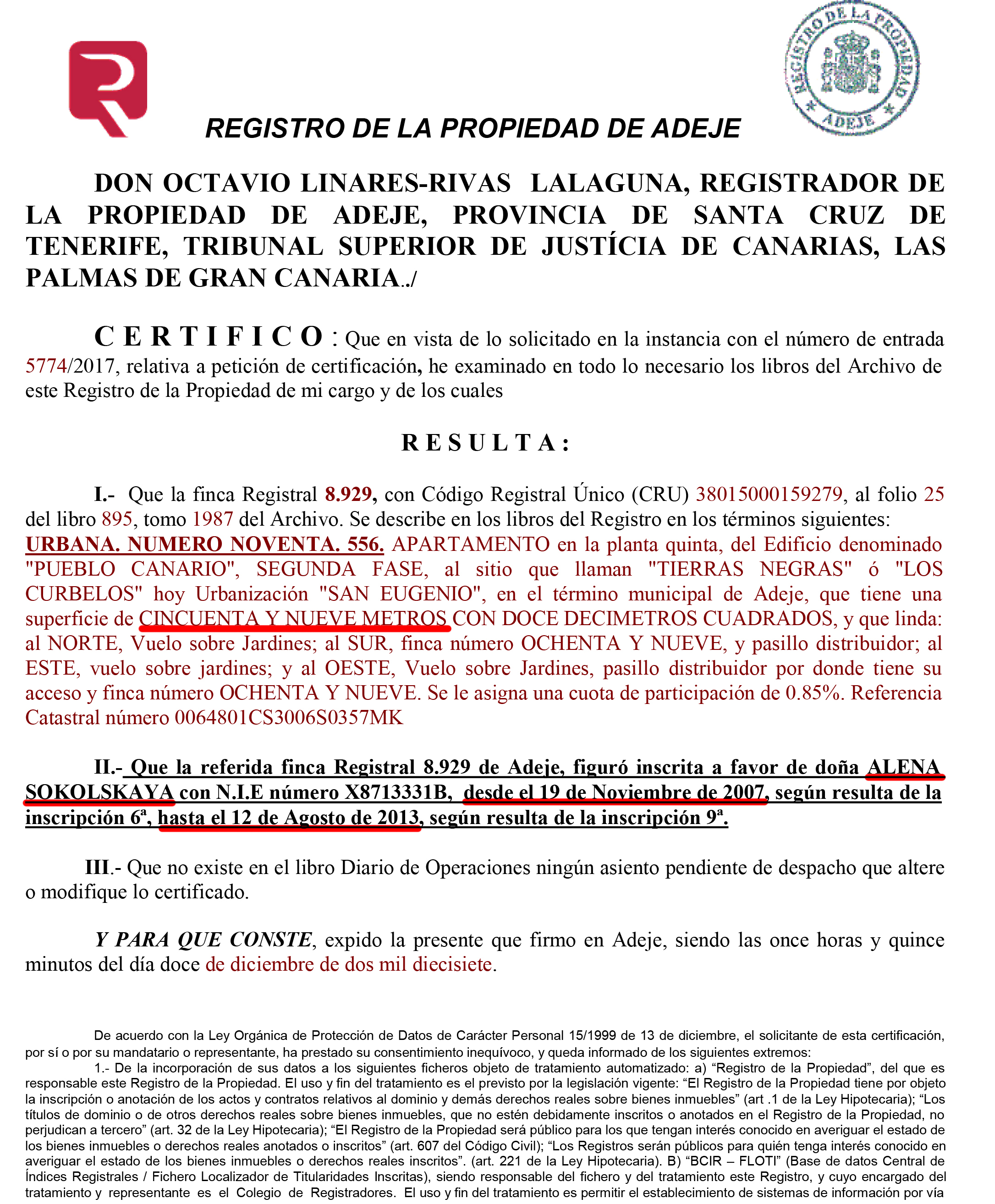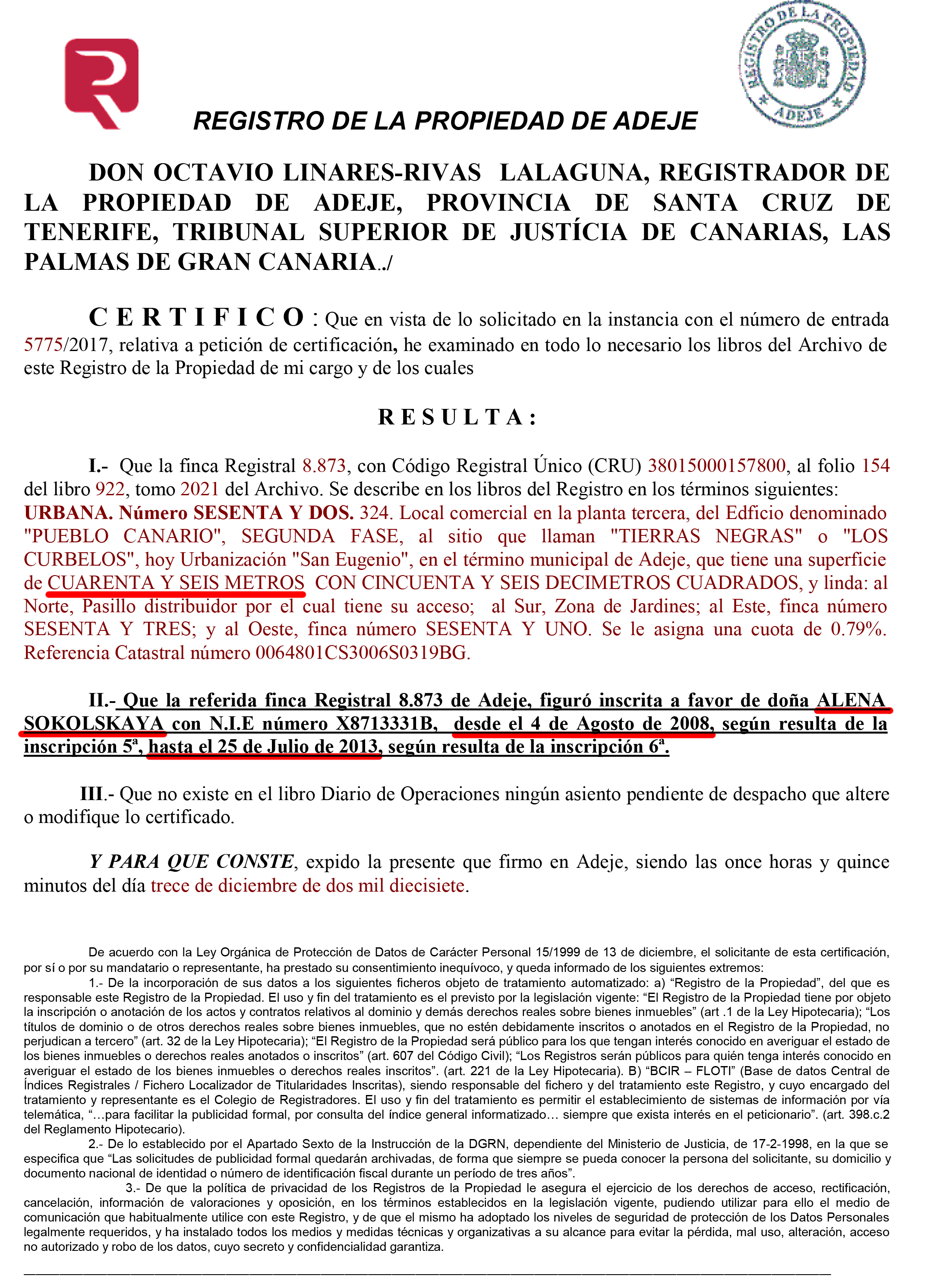 Общая стоимость этой недвижимости сегодня, исходя из среднерыночных цен, – от полутора до двух миллионов евро, в 2007 году цены на Тенерифе были в среднем на 20% выше. В выписках из регистра указаны бывшие и текущие владельцы объектов, имена бывших владельцев полностью совпадают с именами прокурора и клинского главы: Don Alexander Kozlov и Doña Alena Sokolskaya, часть недвижимости была оформлена на дона Dmitry Sokolsky – так зовут сына Алены Сокольской от первого брака. Всего речь идет о шести объектах недвижимости: