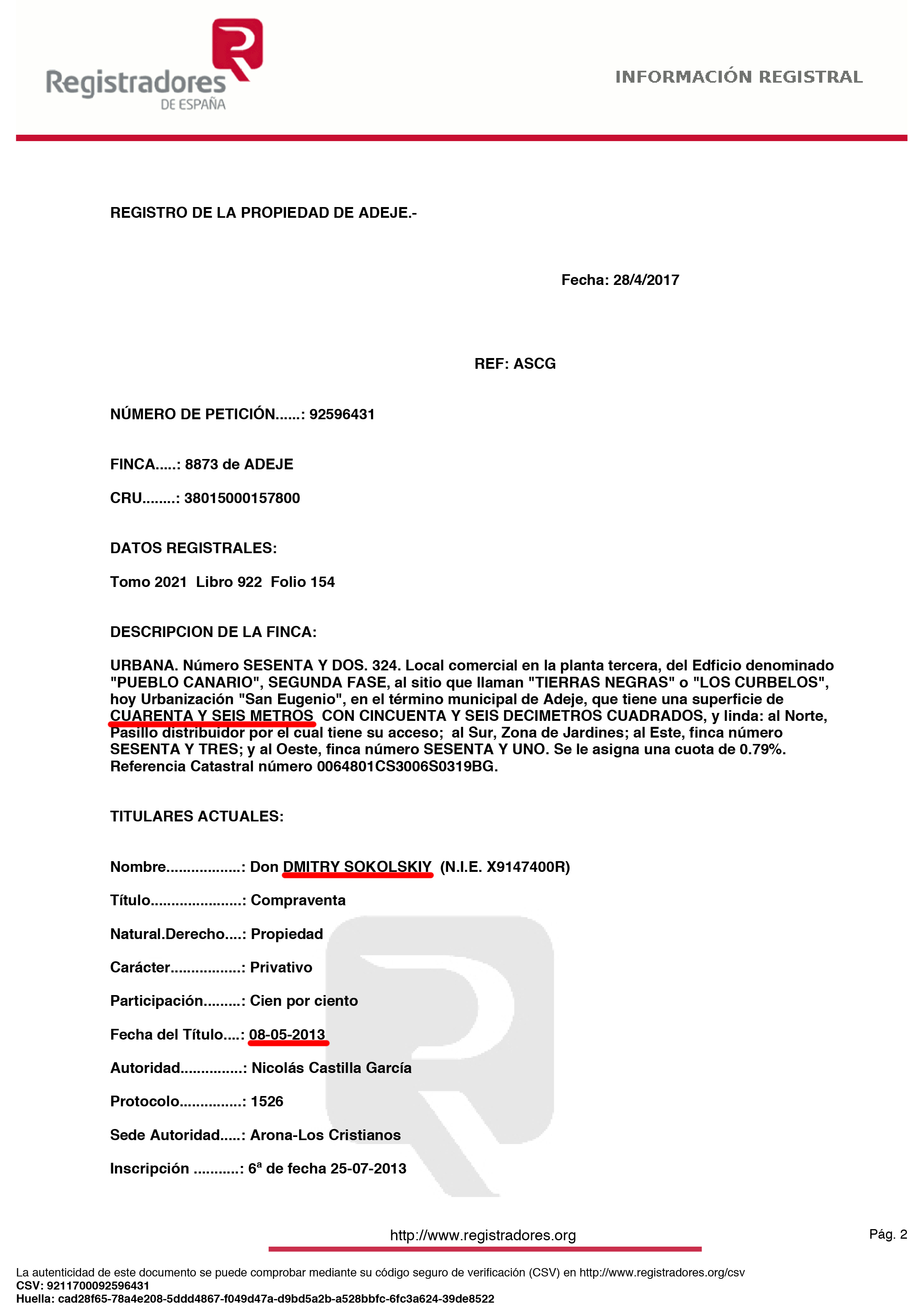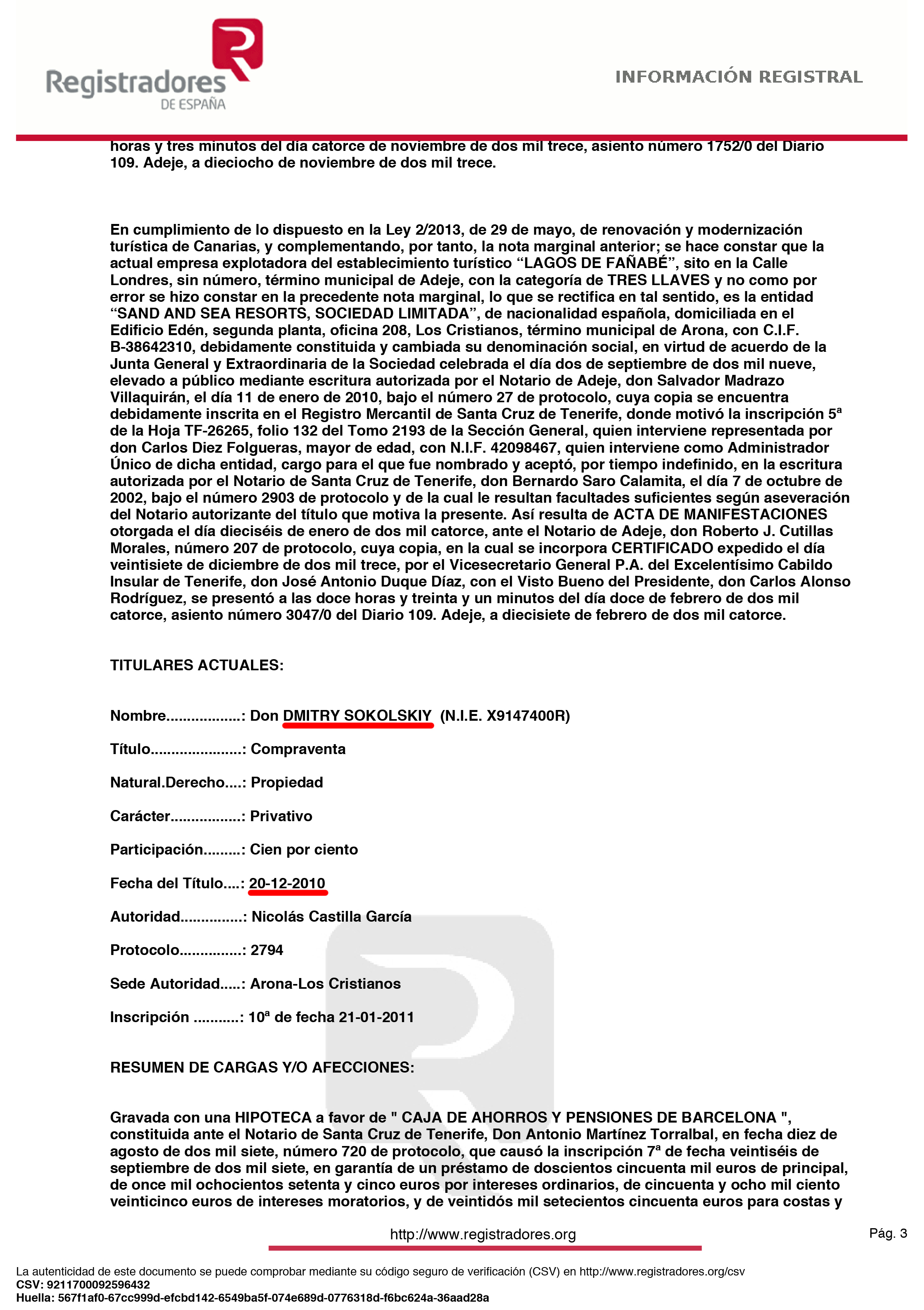 – с 2011 года тому же Дмитрию Сокольскому принадлежат два парковочных места в муниципалитете Адехе.