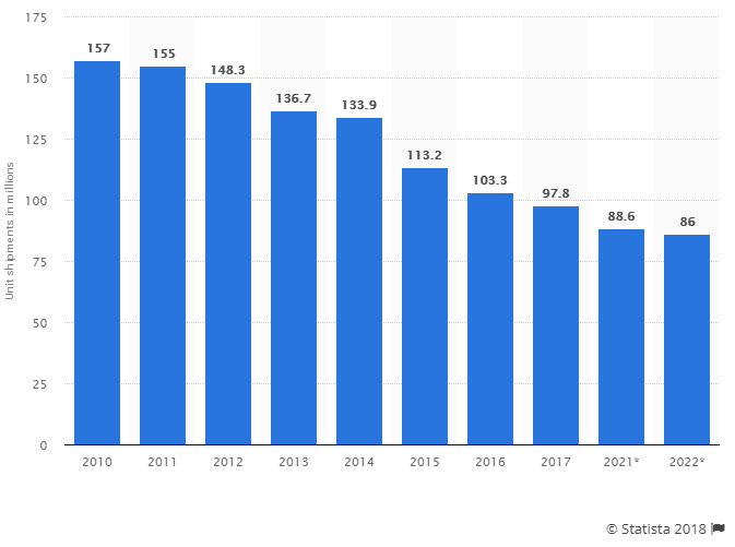 - У скепсиса топ-менеджера по отношению к персональным компьютерам есть основания: по статистике (график ниже), их продажи упорно падают из года в год. И, согласно прогнозам, меняться этот тренд не будет.