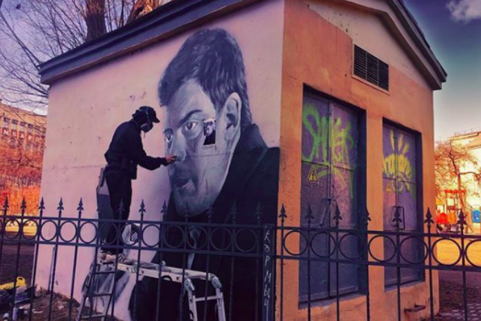 На трансформаторной будке в Пушкарском саду на Петроградской стороне появилось граффити с портретом актера Милана Марича, исполнившего роль писателя Сергея Довлатова в фильме «Довлатов» Алексея Германа-младшего.