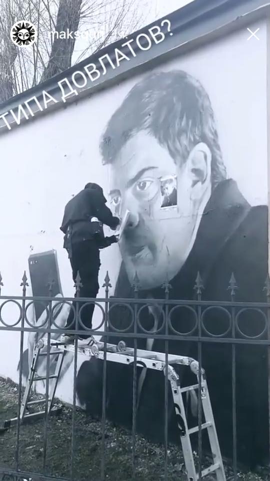 Очевидцы разместили фотографию завершенного граффити. Вероятно, рисунок оказался рекламой онлайн-кинотеатра Okko. Вчера же в официальной группе кинотеатра во «ВКонтакте» появилось сообщение о том, что фильм «Довлатов» выложили на сайт Okko.