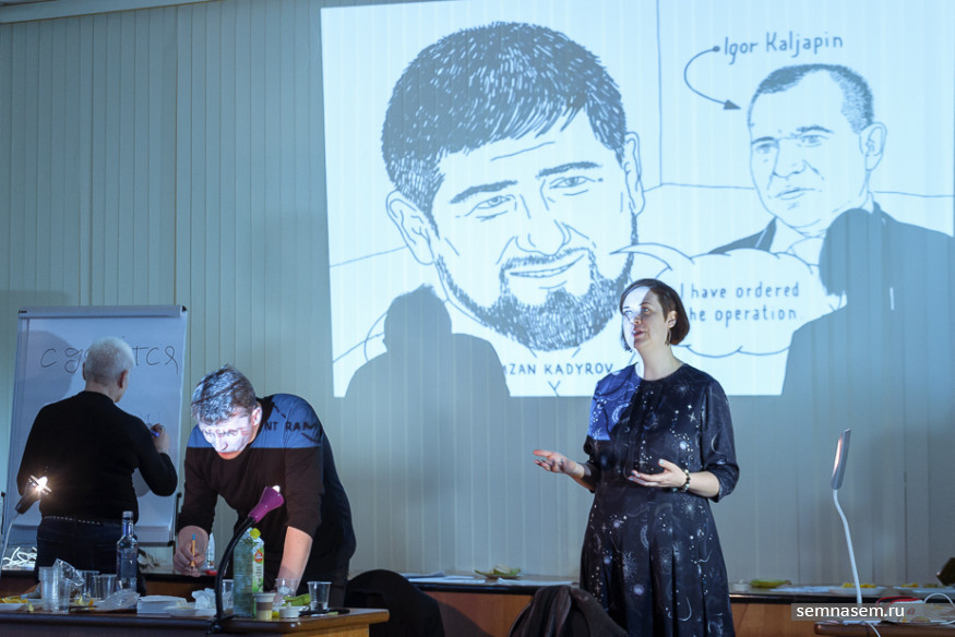 — Мне кажется, что премьера спектакля могла состояться вскоре после нападения на Игоря Каляпина в Грозном [Каляпин — один из героев пьесы «Правозащитники», он руководит Комитетом по предотвращению пыток; в марте 2016 года в столице Чечни на него напали и избили неизвестные], то есть в 2016 году.