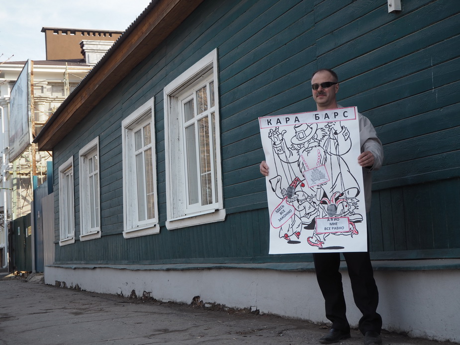 На плакате общественника был нарисован сказочный персонаж Карабас Барабас, дергающий за ниточки кукол — Пьеро и Петрушку. У одного персонажа было лицо губернатора Николая Любимова, у другого — исполняющего обязанности главы городской администрации Сергея Карабасова. Рядом с первым была подписана фраза: «Здесь все законно», рядом со вторым: «А я и. о., мне все равно».