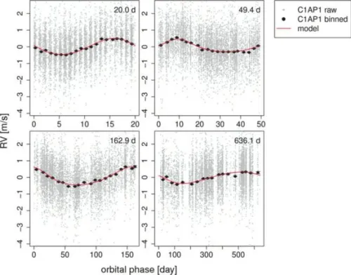 С тех пор команда выросла, методы обработки данных усовершенствованы, и в прошлом году были опубликованы новые результаты работы исследователей [4]. Существование планет с периодами 14, 35 и 94 дня не подтвердилось. Зато существование планет с периодами 168 и 642 дня подтвердилось на более высоком уровне достоверности (периоды немного сдвинулись).
