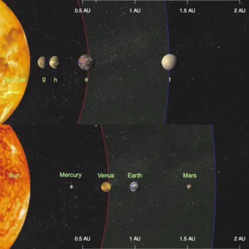 На рисунке изображены планетные системы Тау Кита и Солнца по отношению к зоне обитаемости звезд. Зона обитаемости, конечно, понятие условное — климат на планете сильно зависит от ее атмосферы. В цитируемой работе обсуждение «обитабельности» планет сведено к минимуму. Планета e получает примерно столько же тепла, сколько Венера (которая, возможно, годилась для обитания, пока не произошла парниковая катастрофа).