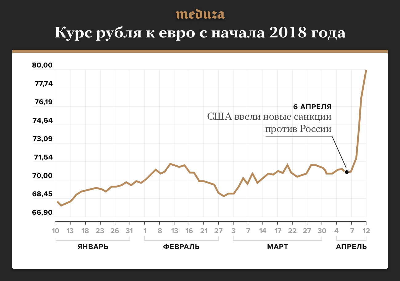 Курс евро на бирже впервые за два года превысил 80 рублей. Падение рубля началось 9 апреля, после введения США санкций против российского бизнеса. Официальный курс ЦБ на завтра — 79,28 рубля, доллара — 64,06 рубля. Вот как менялся курс евро с начала года: