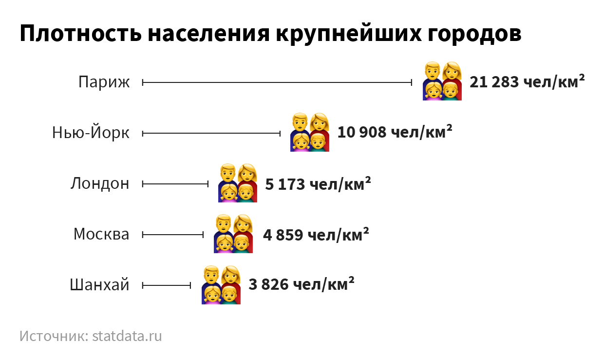 - По численности населения Москва занимает 11 место в мире – в городе живет больше 12 млн человек. И еще 10 млн ежедневно посещают его. Но российская столица достаточно велика, чтобы вмещать такое количество людей: площадь Москвы превышает 2500 км², для сравнения, почти 9 млн жителей Нью-Йорка размещаются всего на 789 км². Такая высокая плотность населения заставляет города буквально расти вверх. Поэтому в Москве небоскребы – пока эксклюзивное украшение города, в отличие от Шанхая или Нью-Йорка, где они – вынужденная реальность.