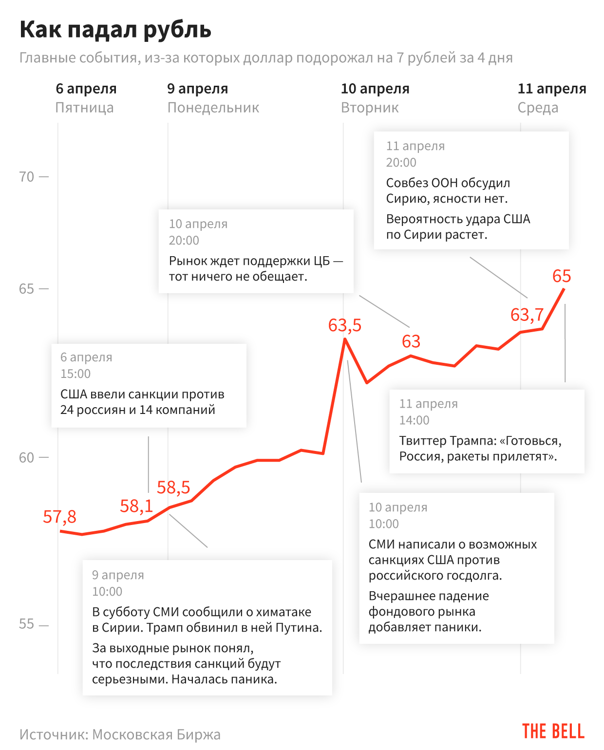 После сегодняшних твитов Дональда Трампа и заявлений американского минобороны сомнений в том, что США в ближайшие дни, а возможно, и часы, нанесут удар по Сирии, нет. Вопрос теперь только в том, насколько масштабным будет этот удар — и каким будет ответ России, который наши официальные лица уже не раз пообещали дать. Худший из возможных сценариев — непосредственный конфликт между странами. А рубль, который уже сегодня упал до 65 руб./$, упадет практически при любом сценарии.