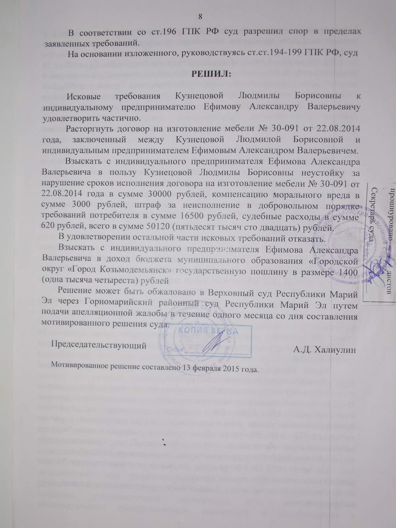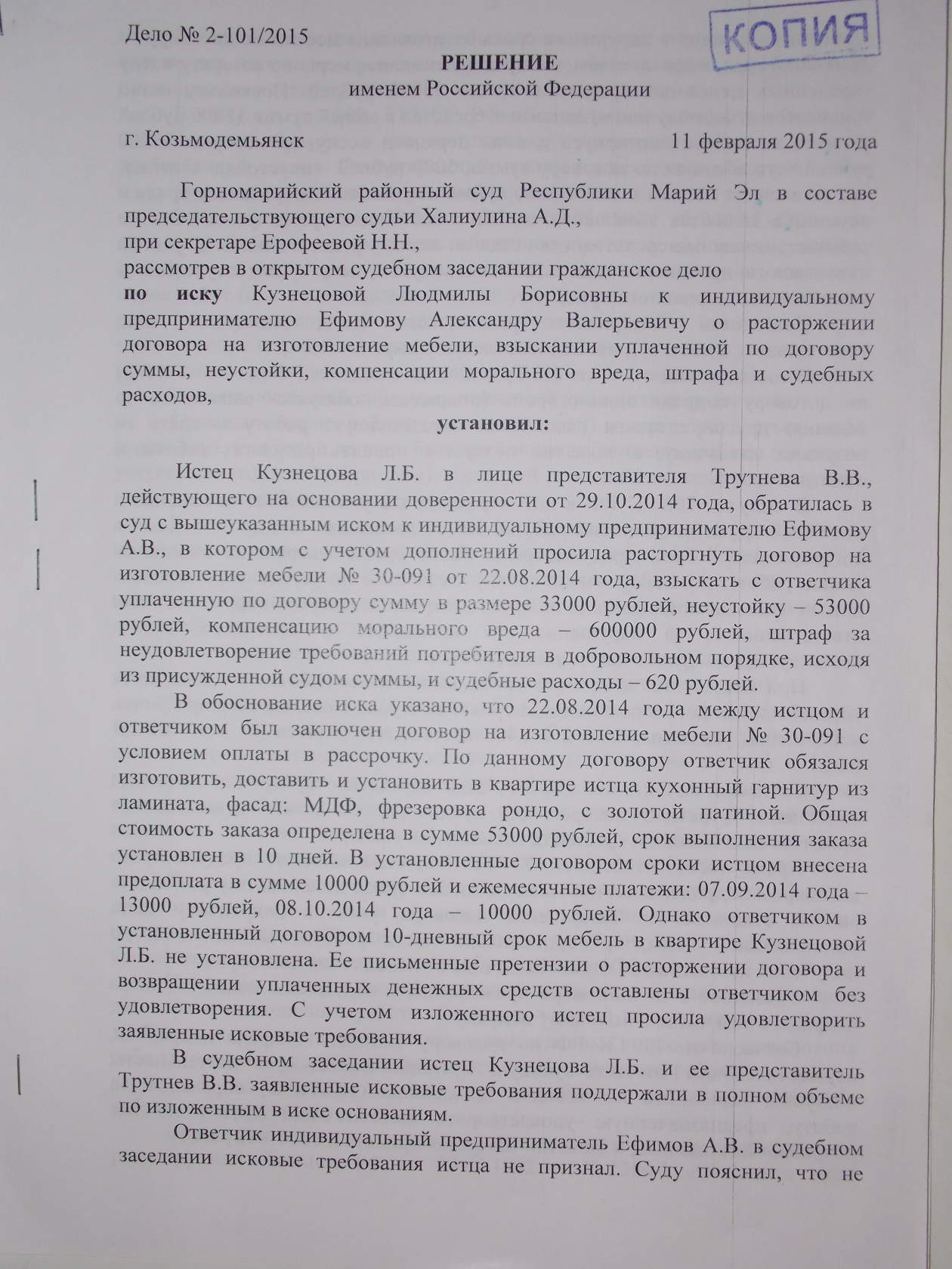Мне довелось познакомиться с ним в рамках одного из гражданских дел, где он проходил ответчиком, а я представителем истца. Ефимов взял предоплату за изготовление мебели, но никакой мебели так и не предоставил. Пришлось обратиться в суд, который помимо прочего постановил взыскать с него 50120 рублей, но это решение суда Ефимов в добровольном порядке не исполнил до сих пор.