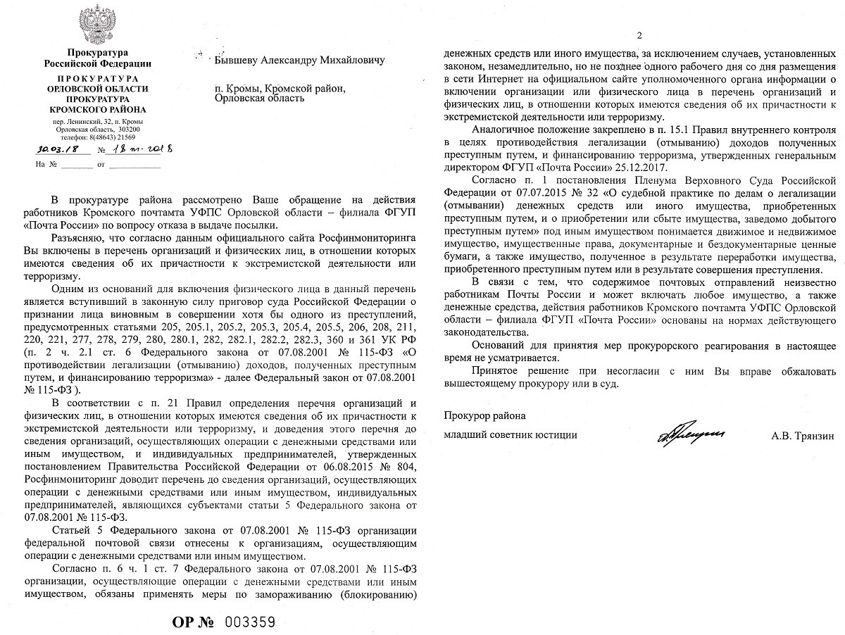 «То есть, самый главный законник Кромского района вполне допускает возможность подобного вопиющего беспредела в отношении меня и это его нисколько не удивляет», - сделал вывод Бывшев. Позднее тот же прокурор Трянзин прислал официальный ответ на двух страницах. Оснований для прокурорского реагирования он не нашёл и объяснил, почему Бывшева отказывается обслуживать «Почта России»: «В связи с тем, что содержимое почтовых отправлений неизвестно работникам «Почты России» и может включать любое имущество, а также денежные средства, действия работников Кромского почтамта УФПС Орловской области – филиала ФГУП «Почта России» основаны на нормах действующего законодательства». Это раньше так и называлось: «поражение в правах». Твоё имя занесли в официальный список действующих террористов и экстремистов? В таком случае, всё, что может попасть в твои руки – потенциальное орудие преступления («любое имущество», «денежные средства»). И совершенно неважно, что у тебя больные родители и лекарства предназначаются им.