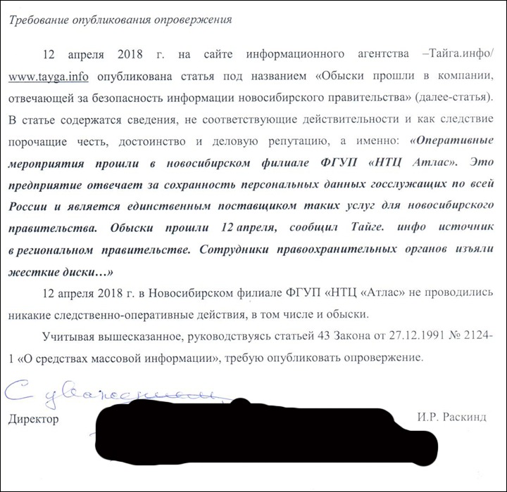 В новосибирском филиале ФГУП «НТЦ „Атлас“» не проходили оперативные мероприятия, заявил Тайге.инфо директор филиала Игорь Раскинд. Редакция публикует его комментарий.