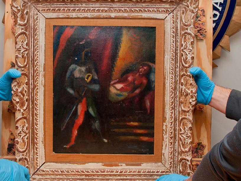 Картина, извлеченная из тайника FBI Сотрудники отдела ФБР, занимающегося расследований краж предметов искусства, сообщили, что им удалось найти похищенную картину Марка Шагала «Отелло и Дездемона». Картина обнаружена спустя тридцать лет после исчезновения.