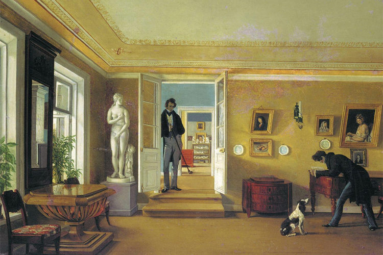 На первой картине мы видим анфиладу комнат большой квартиры — или даже усадьбы — первой трети XIX века. Собственно, комнат четыре; череда дверных проемов — все более узких и низких, как учит перспектива, — ведет наш взгляд сквозь, пока он не упирается в стену последнего из помещений. Впрочем, это не настоящая стена, а тоже дверь, но закрытая, причем перманентно; она превращена в своего рода украшение, в часть дизайна последней комнаты анфилады, к ней приставлена этажерка, населенная, насколько это возможно разглядеть в глубине картины, мелкими гипсовыми слепками классицистической скульптуры. На самóй двери, похожей на алтарь, висят четыре картины, образуя крест, осеняющий этажерку, которая составляет как бы основание этого креста. Картины по бокам и сверху разглядеть сложно, в центре же — портрет мужчины. В предпоследней комнате у двери стоит коричневый комод, а во второй от нас комнате, буквально на пороге первой, отчасти загораживая перспективу, дверной косяк подпирает молодой человек в светло-серых панталонах, черном фраке с белым жилетом, черном же шейном платке и черных штиблетах. Прическа его, по моде конца 1820-х годов, с начесанным чубом. В руках молодой человек держит невероятно длинную курительную трубку чашей вниз. Он скучает, его поза хорошо это передает.