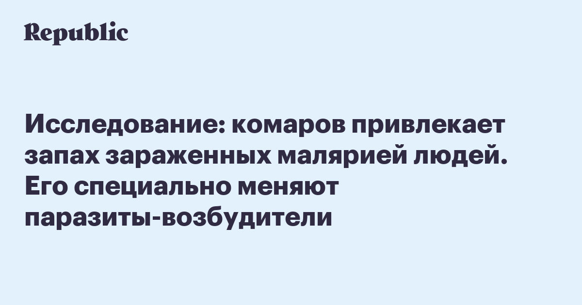 Возбудители малярии способны менять запах кожи человека, привлекая таким образом комаров, переносящих заболевание. Это выяснили ученые из Лондонского института гигиены и тропической медицины, их работа опубликована в Proceedings of the National Academy of Sciences, кратко о ней пишет The Independent.