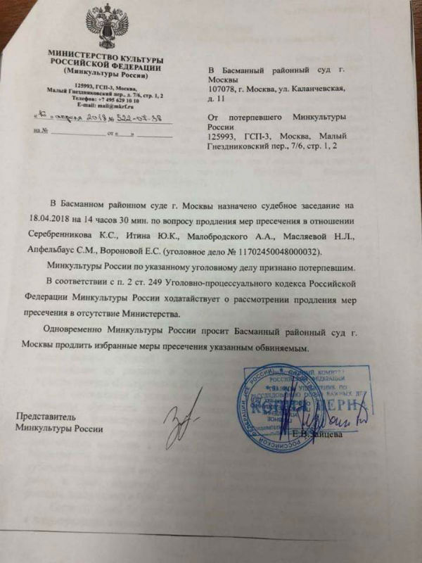 Министерство культуры просило продлить меры пресечения всем четверым фигурантам. Ведомство, признанное потерпевшей стороной, направило в суд письменное ходатайство. В свою очередь, адвокаты просили освободить театральных деятелей под залог.
