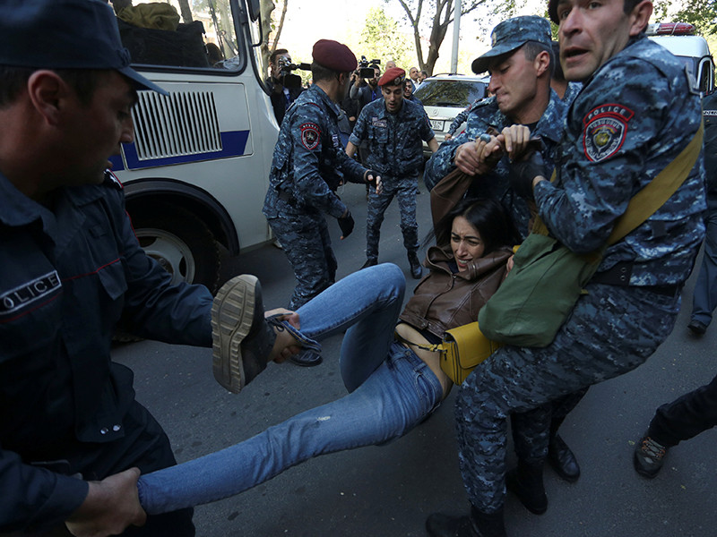 По данным News.am, участники акции на площади Республики оказывают сопротивление стражам порядка: они садятся на землю в знак протеста. Наиболее активных участников полицейские уносят на руках в микроавтобусы, на которых отвозят в участки.