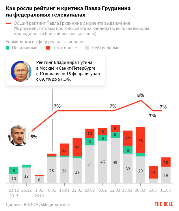 - Падение тогда произошло на фоне появления и роста рейтинга кандидата от КПРФ Павла Грудинина — несмотря на то что на федеральных каналах о нем очень быстро начали говорить в негативном контексте.