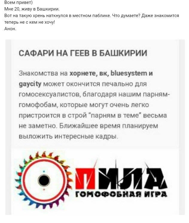 Руководитель башкирского отделения "Альянса гетеросексуалов и ЛГБТ за равноправие" Кристина Абрамичева заявила, что в Уфе "идет охота на геев под названием "Пила".