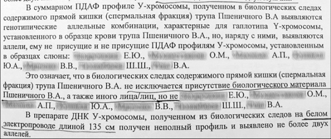 Чтобы выяснить, кто мог причинить Пшеничному все эти повреждения, эксперты провели анализ биоматериалов его сокамерников и пятерых сотрудников СИЗО. На черном электропроводе обнаружены ДНК двух мужчин. Среди тюремщиков и заключенных, чьи материалы исследовали, их не оказалось. На белом шнуре была найдена ДНК некоего Захарочкина Е. Ю., по всей видимости – сотрудника СИЗО. Его же следы обнаружены на палке с изолентой.