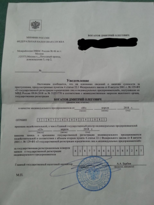 В уведомлении ФНС говорится, что регистрацию ИП признали недействительной из-за судимости Богатова. Однако суд еще не выносил приговор по его делу, а значит, судимости нет.