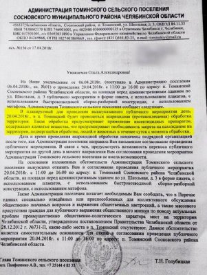 Сообщение, в котором администрация говорила о том, что «вынуждена отказать» в проведении пикета, организаторы получили уже после того, как мероприятие было согласовано. Оно должно было пройти перед зданием администрации 20 апреля. Как объясняет на своей странице в фейсбуке активист местного движения «Стоп ГОК» Борис Золотаревский, в ходе неофициального разговора с главой администрации поселения Татьяной Голубицкой выяснилось, что ей позвонили «сверху» и потребовали воспрепятствовать проведению пикета.