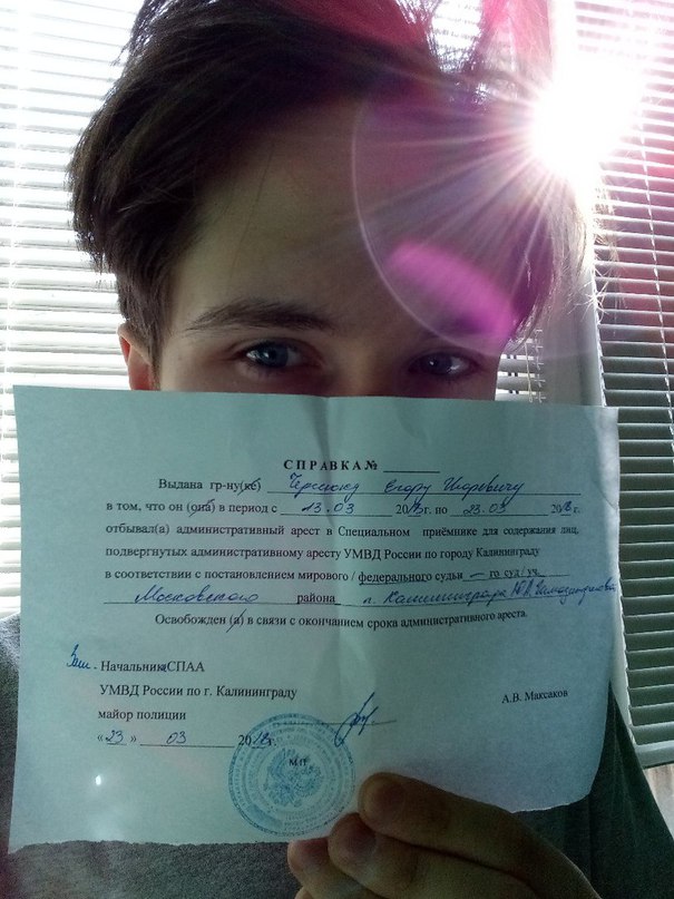 Егор Чернюк, координатор штаба Навального в Калининграде, один из героев фильма Андрея Лошака “Возраст несогласия”, номинант на премию Бориса Немцова за смелость в отстаивании демократических ценностей в России, был вынужден срочно уехать за границу. Егора, как и других сторонников Навального, задерживали и допрашивали сотрудники полиции и Центра “Э” во время всей избирательной кампании. Осенью прошлого года “эшники” угрожали “засунуть” активиста в армию, если он откажется с ними сотрудничать. “Я не годен к военной службе по медицинским показаниям, но эшники сказали, что в армию меня все равно заберут и никакой адвокат мне не поможет”, – рассказывал Егор Радио Свобода полгода назад. После выборов президента России на Егора завели уголовное дело за уклонение от службы в армии. Наказанием по этой статье может быть срок лишения свободы до двух лет.