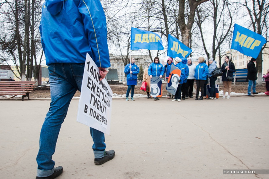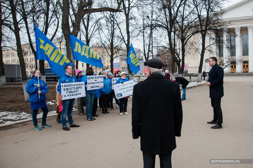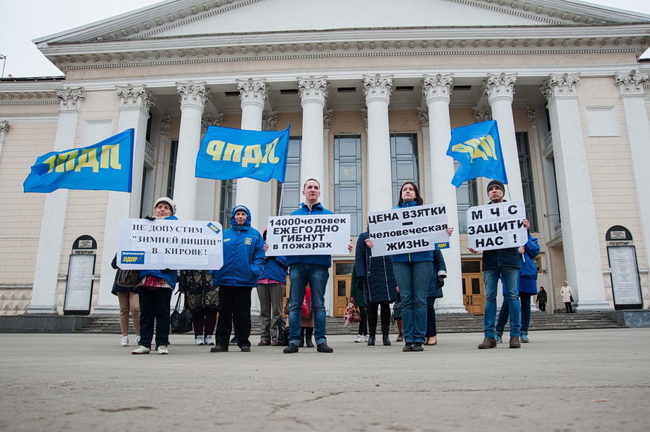 В Кирове 21 апреля у Театральной площади состоялся митинг с требованием к прокуратуре и МЧС опубликовать полный список торговых центров, в которых были найдены нарушения пожарной безопасности. Организовал акцию член ЛДПР Кирилл Писный. Несмотря на объявления в СМИ и социальных сетях, на акцию пришло не больше 15 человек, все они были сторонниками партии. О том, как прошел десятиминутный митинг, — в репортаже «7x7».