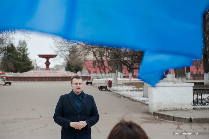 Группа выстроилась полукругом около лавочек в сквере, один из организаторов давал разъяснения, как держать плакаты и кому взять флаги. К Кириллу Писному в этот в момент подошла дама, которая поинтересовалась, что происходит.