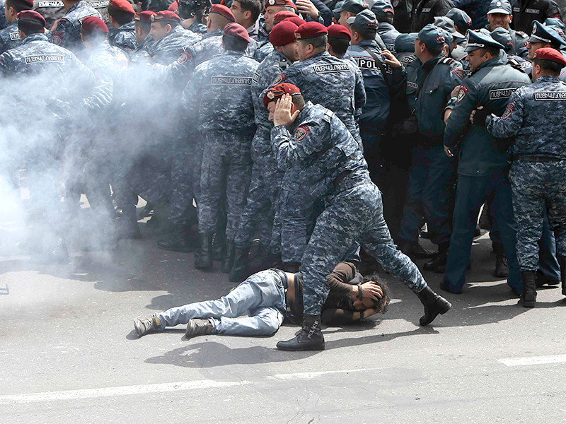 В Ереване полиция начала разгон демонстрантов с использованием спецсредств. СМИ сообщают о задержании лидера протестов Никола Пашиняна и нескольких пострадавших. Происходит это после быстротечных переговоров Пашиняна с премьером Саргсяном, отставки которого он добивается. Премьер, отработавший ранее два президентских срока, назвал требования оппозиции "шантажом государства".