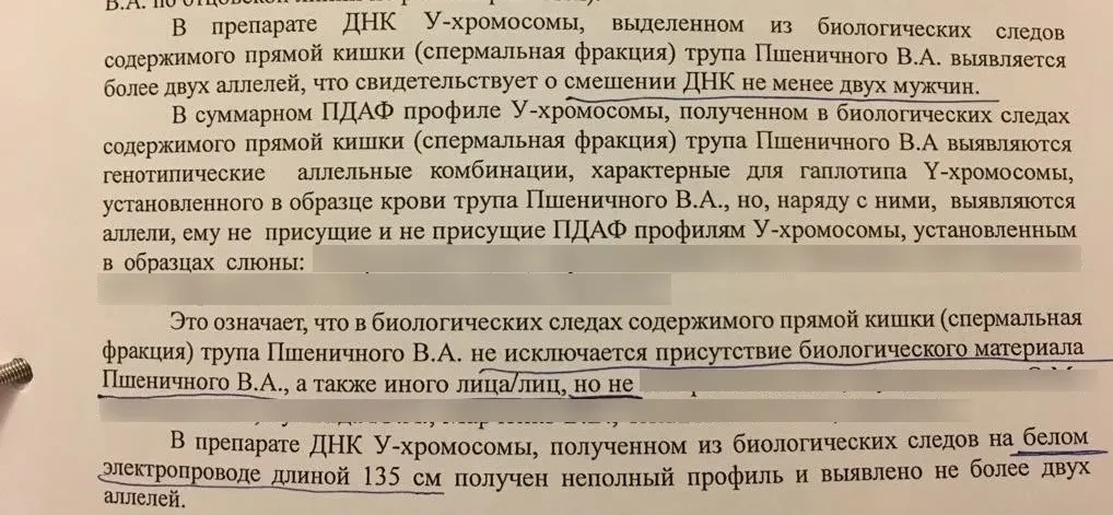 Чтобы выяснить, кто мог причинить Пшеничному все эти повреждения, эксперты провели анализ биоматериалов его сокамерников и пятерых сотрудников СИЗО. На черном электропроводе обнаружены ДНК двух мужчин. Среди тюремщиков и заключенных, чьи материалы исследовали, нет ни одного из них. На белом шнуре была найдена ДНК некоего Захарочкина Е.Ю., по всей видимости, — сотрудника СИЗО. Его же следы нашлись на палке с изолентой.
