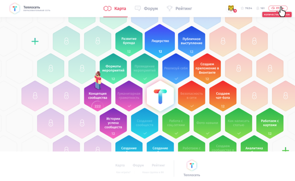 «Теплосеть» представляет собой игровую карту, которая делится на 6 направлений: «Саморазвитие», «Создание сообщества», «Прикладные цифровые навыки», «Web-технологии», «Дизайн мероприятий», «Гуманитарная грамотность».