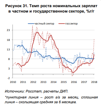 - Как пишет ЦБ, этот взлет будет связан, в первую очередь, с индексацией зарплат согласно подписанным в 2012 году «майским указам» (они требуют к 2018 году поднять зарплаты бюджетникам до 100-200% от средних по региону), а также с запланированной индексацией зарплат других работников.