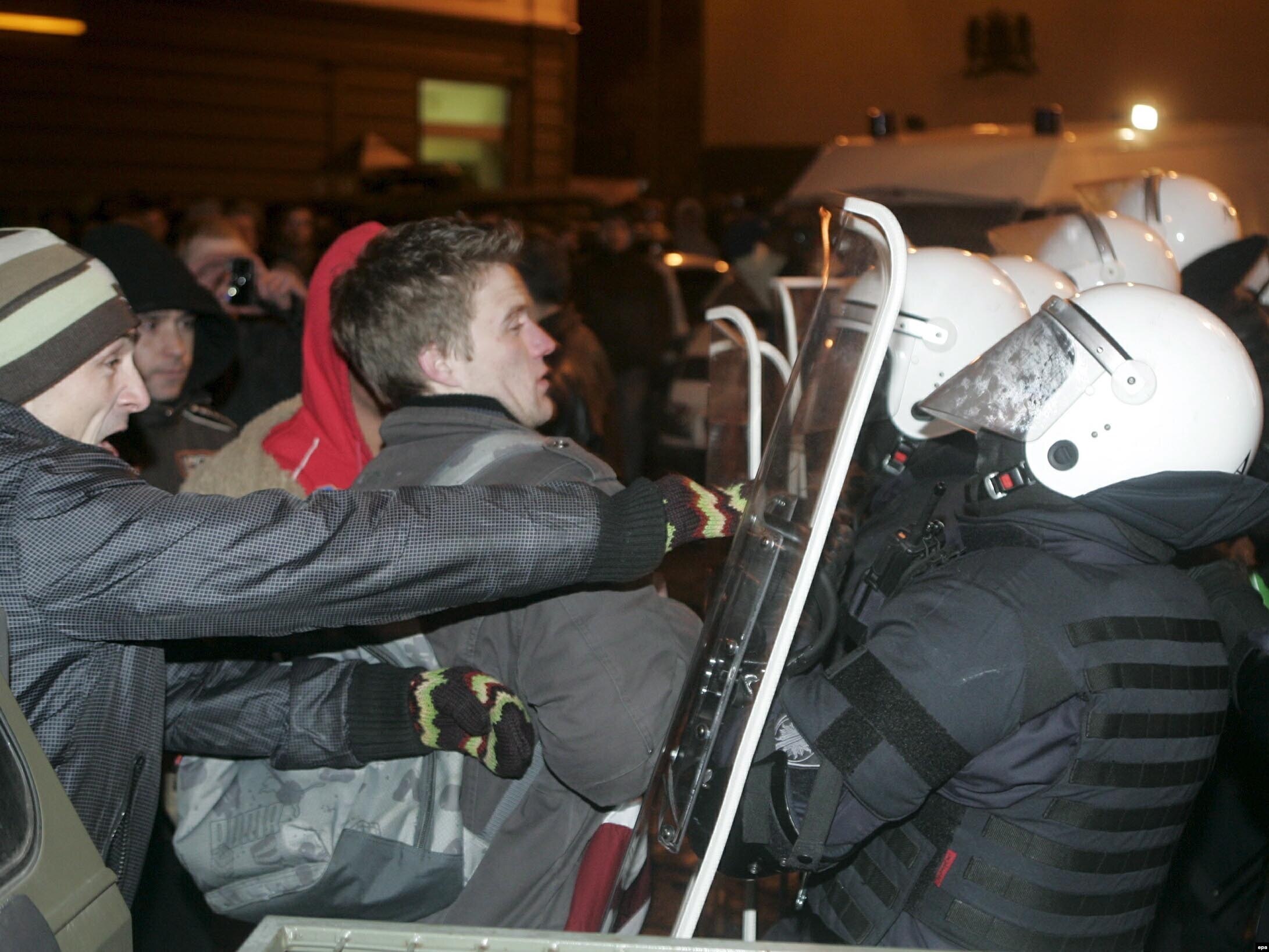 Речь идет о так называемой "Революции булыжников". 13 января 2009 года, в годовщину начала в Латвии двух революций – 1905-го года и Революции баррикад 1991 года - в Риге на Домской площади состоялся антиправительственный митинг, собравший более 10 тысяч латвийских жителей, измученных экономическим кризисом. Заявку на его проведение в Рижскую думу подали три лидера зарегистрированной недавно оппозиционной партии «Общество за другую политику» - два экс-министра Айгарс Штокенбергс и Артис Пабрикс и помощник евродепутата Гундарс Романовскис. Они требовали роспуска Сейма. Митинг, который поддержали в общей сложности 25 партий и общественных организаций, начался в половину шестого, а спустя полтора часа Артис Пабрикс закрыл мероприятие, предложив участникам расходиться по домам. Несколько сотен человек, разгоряченных речами ораторов, двинулись к Сейму. Они выворачивали булыжники из мостовой, бросали в окна бутылки и куски льда, пытаясь прорваться внутрь здания, переворачивали машины и громили витрины. Полиция смогла разогнать толпу только к 22 часам.