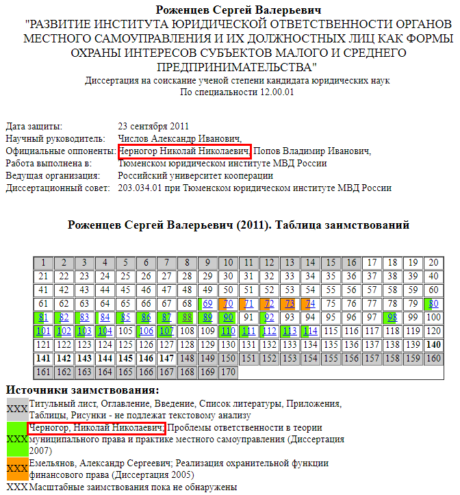 На 24 страницах имеются заимствования (иногда масштабные, целыми страницами) из диссертации Н. Н. Черногора от 2007 года. Кроме этого, на пяти страницах имеются некорректные заимствования по полстраницы из диссертации А. С. Емельянова от 2005 года (совместных работ С. В. Роженцева и А. С. Емельянова не обнаружено).