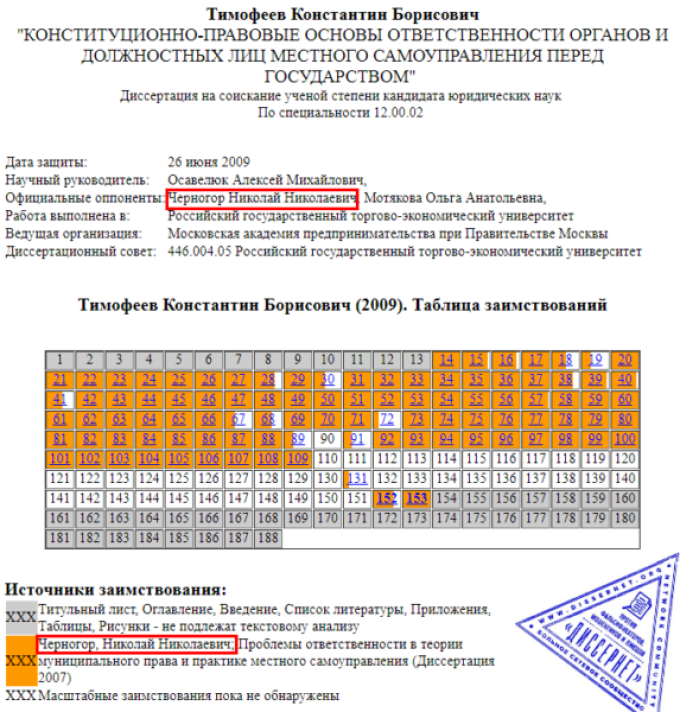 2. Кандидатская диссертация К. Б. Тимофеева «Конституционно-правовые основы ответственности органов и должностных лиц местного самоуправления перед государством» от 2009 года. 95 страниц (из 140) практически целиком совпадают со страницами диссертации Н. Н. Черногора от 2007 года.