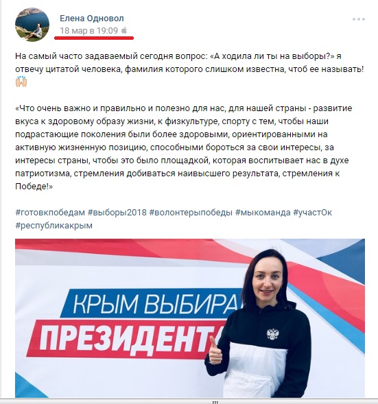 Содержание страниц Одновол в соцсетях свидетельствует о том, что она не только сама ходила голосовать на выборы российского президента, но и призывала к этому крымских студентов.