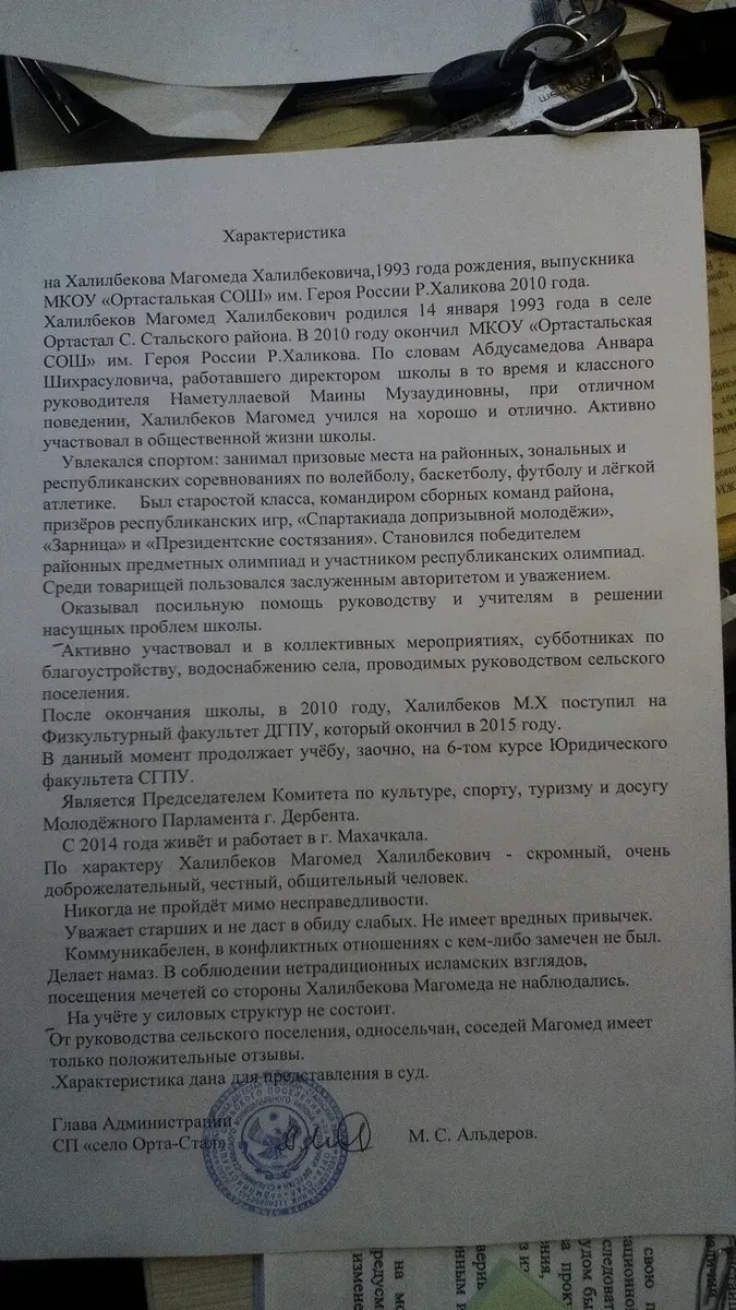 На характеристику Халилбекова от главы администрации села Орта-Стал Альдерова суд внимания не обратил: «Соблюдения нетрадиционных исламских взглядов, посещения мечетей со стороны Халилбекова Магомеда не наблюдалось. На учете у силовых структур не состоит».